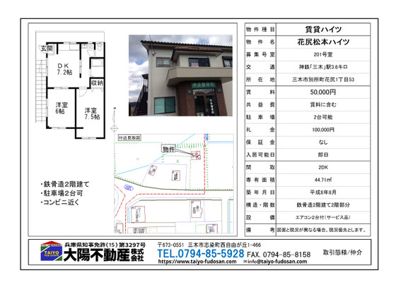 29日 8月 2025 花尻 ハイツ2DK エアコン2台あり 賃料 5.0万円 所在地 三木市別所町花尻 交通 神戸電鉄/三木駅 車約10分 共益費 なし 敷金 なし 礼金 10万円 構造 鉄骨造2階建2階部分 築年月日 平成8年8月 専有面積 44.71m² 間取り 2DK 駐車場 2台分あり(賃料に含) 現況 空 引き渡し 即時 設備 プロパンガス 上下水道 備考 エアコン・照明あり(残置物) 連帯保証人要 家賃保証加入要 火災保険加入要 ※入居者数2名まで 駐車場あり 清掃済 コンビニ徒歩1分 詳細写真・間取り tagPlaceholderカテゴリ: 借りる, 居住用