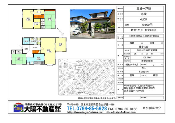 20日 10月 2025 自由が丘本町3丁目貸戸建 4LDK ペット相談可(条件有) 賃料 7.0万円 所在地 三木市自由が丘本町3丁目 交通 神戸電鉄 志染駅 徒歩10分 敷金 1ヶ月 礼金 2ヶ月 構造 木造2階建 駐車場 あり(1台分) 設備 専有面積 106.74m² 間取り 5DK 築年月日 昭和56年4月 現況 空 引き渡し 相談 備考 照明器具・エアコンはサービス品 ペット可 (礼金1か月分UP・室内犬1匹) 保証人要 賃貸保証加入必須 (契約時賃料1か月分・更新料なし) 家財総合保険加入要 (2年間:23,900円) 4LDK ペット可 駐車1台可 詳細写真・間取り tagPlaceholderカテゴリ: 借りる, 居住用